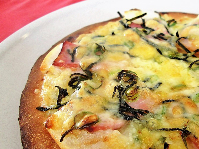 醬油マヨソースの上に、スライスオニオン、ベーコン、スライス餅、刻みのり、小口切りねぎをトッピング。モチっとした和風のピザです。
